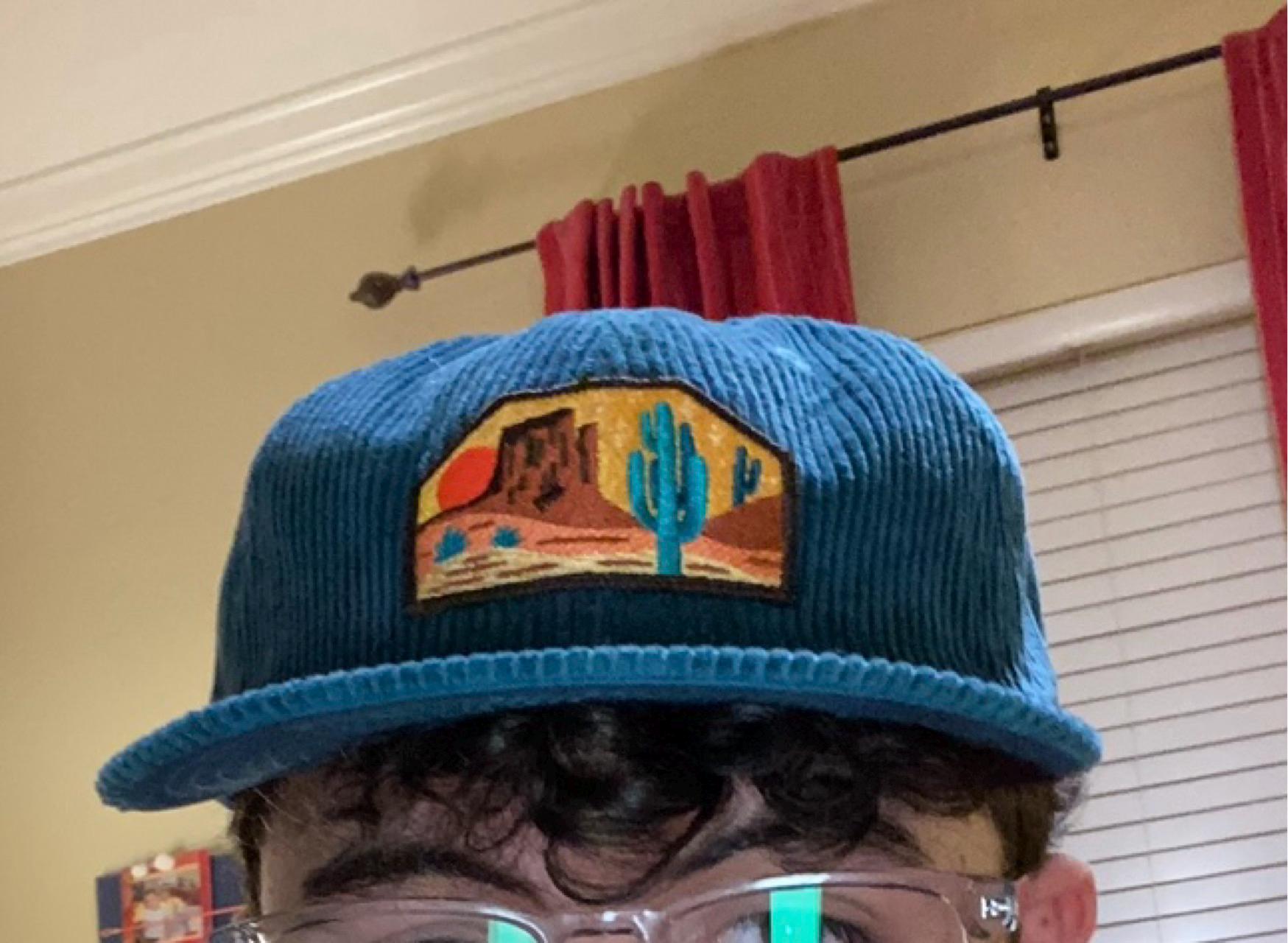 I've always had a love of the desert and cactus and I wanted to create a patch and hat that epitomized the beauty of it. This hat is made personally by me. I start by embroidering the patch, then machine sewing it onto a corduroy hat.