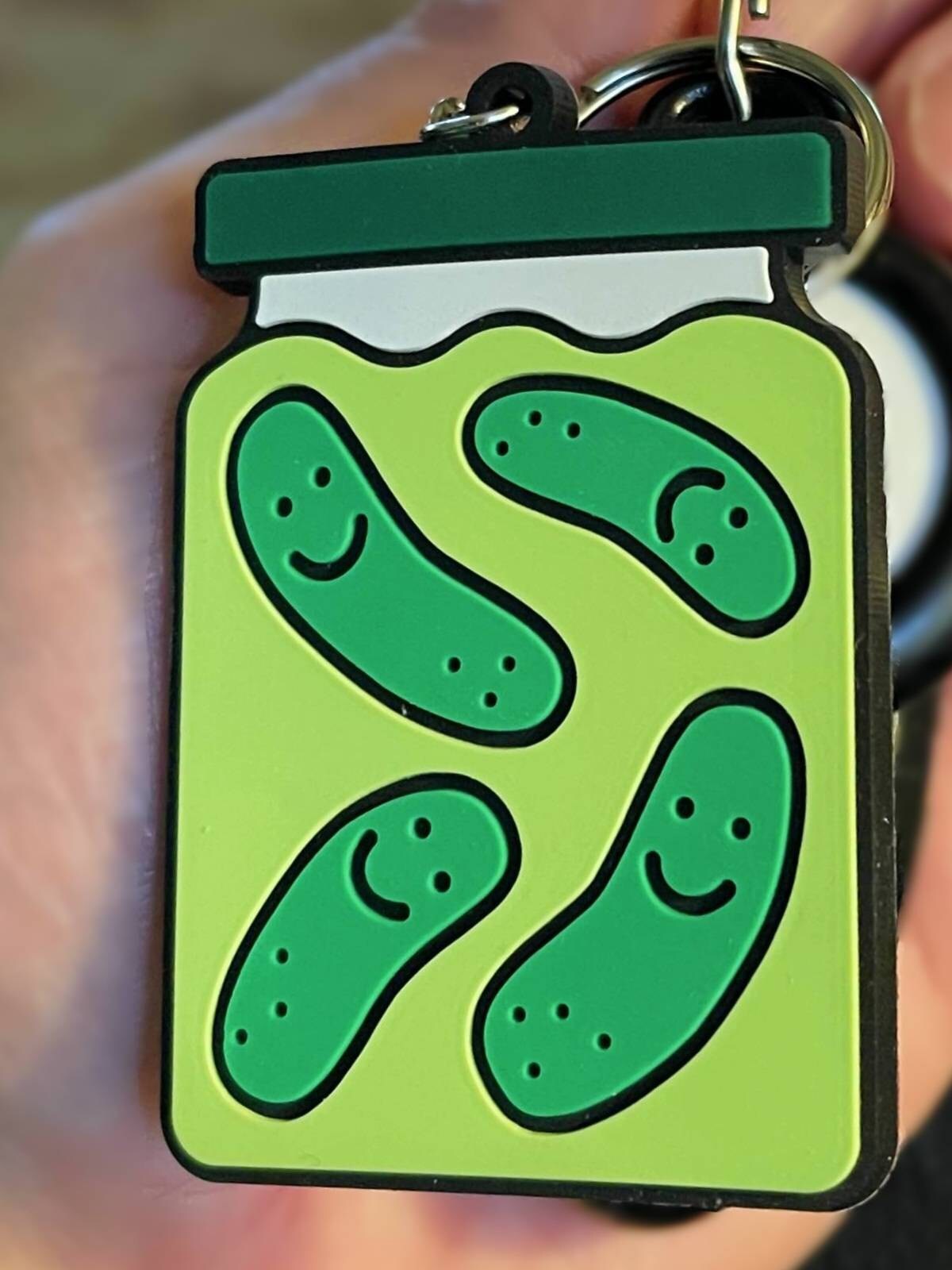 This PVC pickle jar keychain is the perfect addition to your keys, backpack, or whatever! It measures approx 2.5” tall and is soft and flexible.