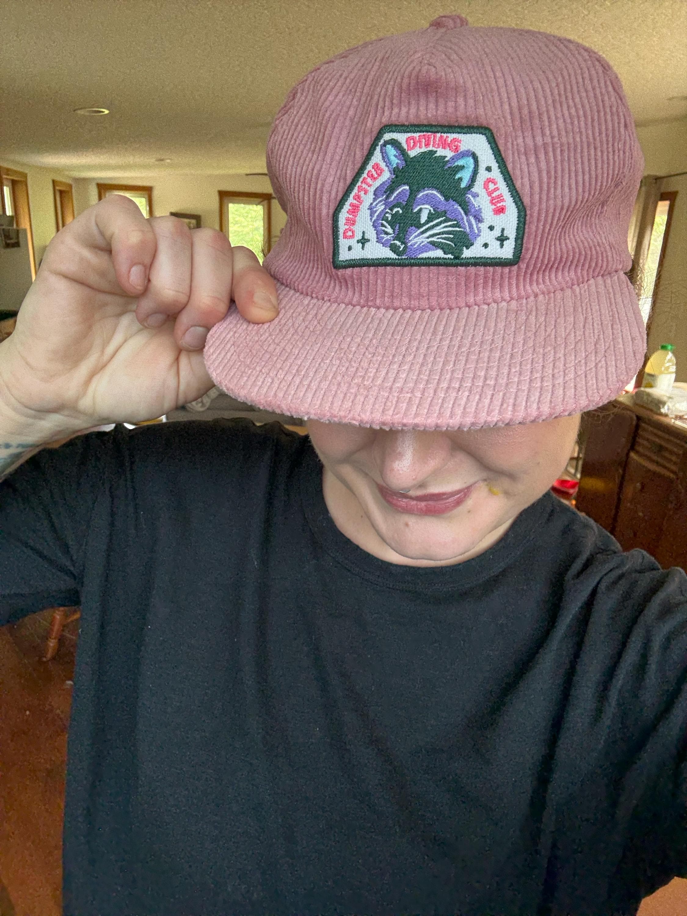 If you’re always on the hunt for the best deal or thrift store find, this hat is for you! Thrifting is one of my favorite things to do with friends, so this design was a no brainer to make. Featuring a cute raccoon, who knows a good deal when they see it.